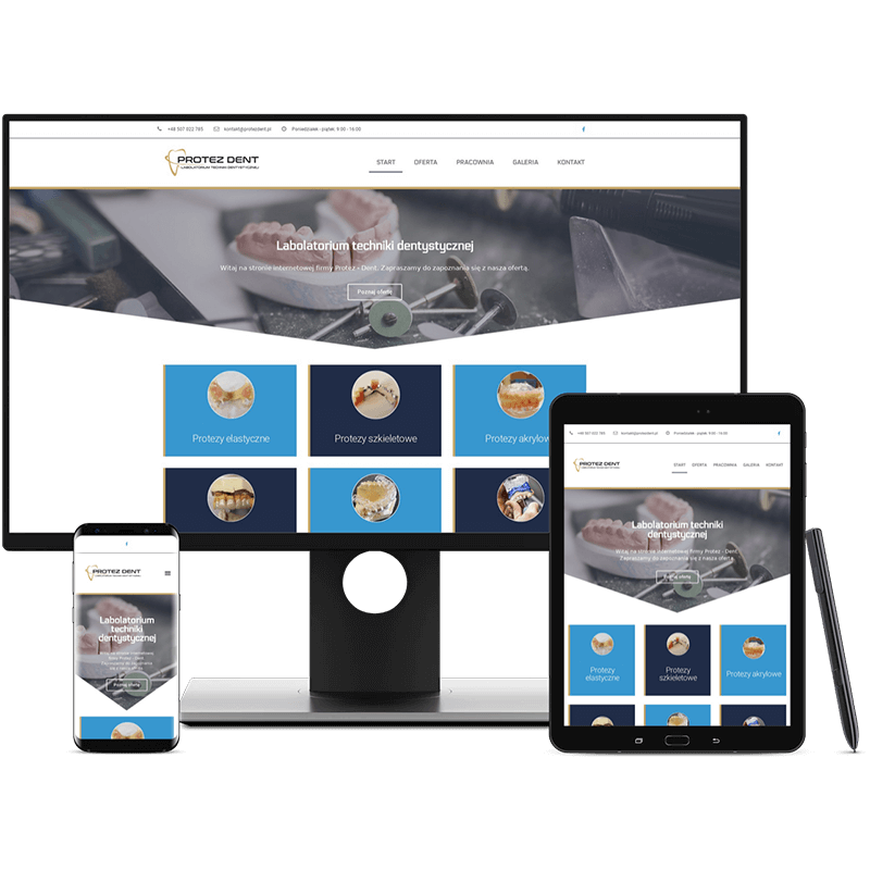 Protez – Dent to Laboratorium Techniki Dentystycznej, które mieści się w Wałczu przy ul. Wojska Polskiego 2-6. Zbudowaliśmy stronę internetową firmy, która zawiera: czytelnie przedstawioną ofertę, mapkę z lokalizacją, galerię zdjęć, slider na stronie głównej. Layout dopasowaliśmy do logotypu firmy, całość prezentuje się bardzo nowocześnie. W ramach wdrożenia zarejestrowaliśmy domenę internetową, oraz utworzyliśmy skrzynkę e-mail.